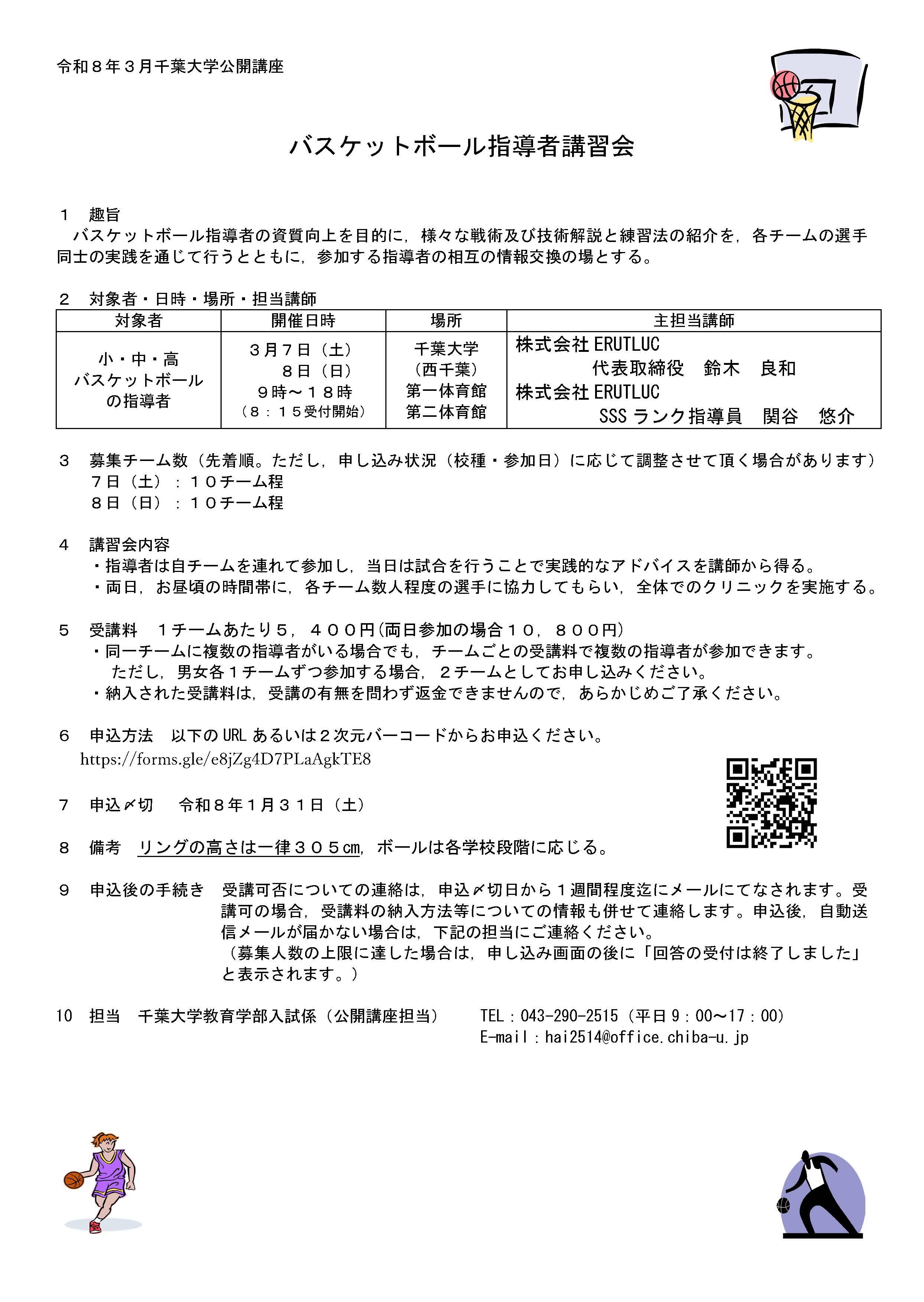 千葉大学教育学部公開講座「バスケットボール指導者講習会(3月)」開催のお知らせ
