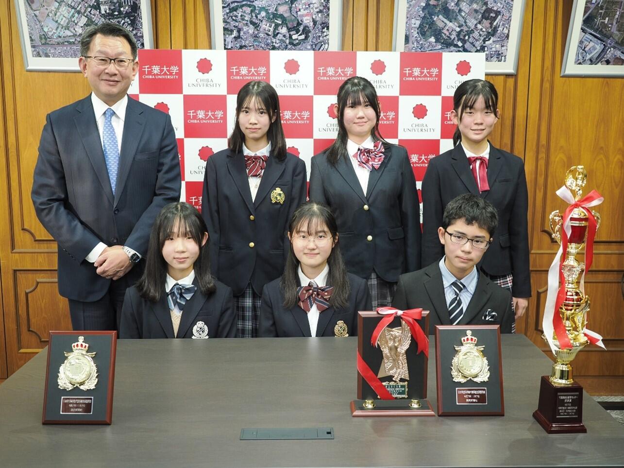 『千葉県児童生徒・教職員科学作品展』受賞者の3名の生徒と『高円宮杯日本武道館書写書道大展覧会』受賞者の3名の生徒が、12月18日に横手学長を表敬訪問し、受賞の報告をしました。